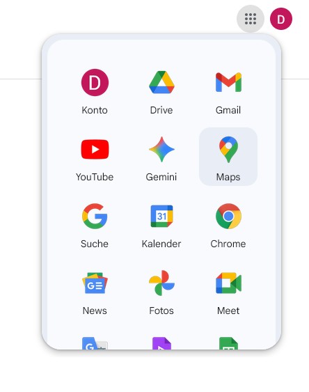 Die zur Verfügung gestellte Software ist direkt in Form von online Apps verfügbar. Eine Installation ist nicht notwendig und betriebssystemunabhängig. Nachdem Erstellen eines kostenlosen Google-Kontos, klicken Sie zur Programm-Übersicht oben rechts auf das Mehrpunktesymbol neben Ihrem Profilbild.